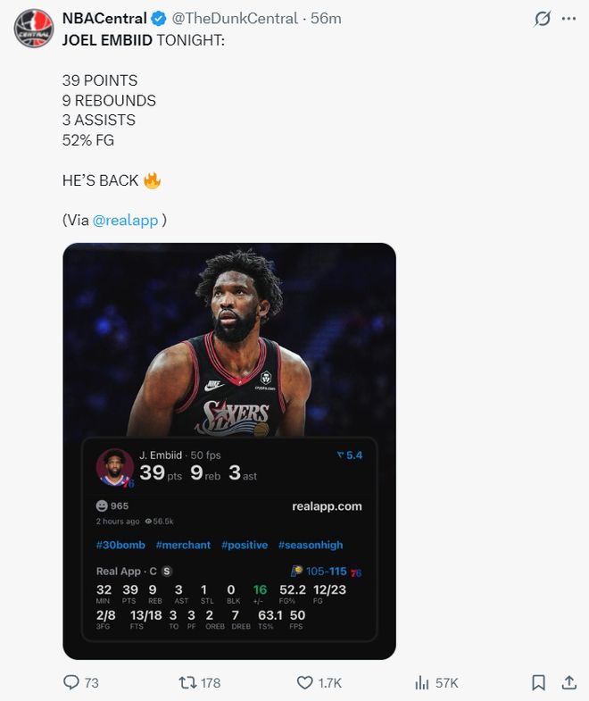 此役恩比德仅登场32分钟,23中12,三分8中2,罚球18中13,拿到39分9篮板3助攻1抢断,命中率52.2%,真实命中率63.1%,正负值+16,他的得分创造赛季新高,美媒NBA Central写道:大帝归位。