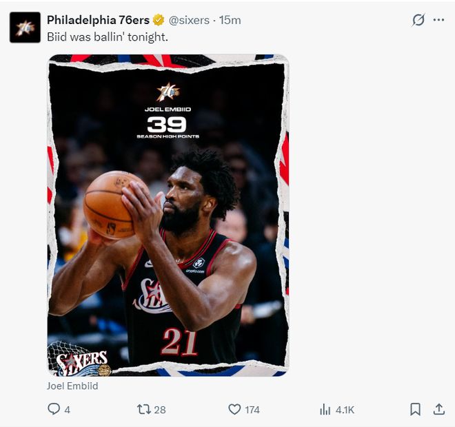 费城官方晒出恩比德39分的海报写道:这个夜晚恩比德的状态很好。