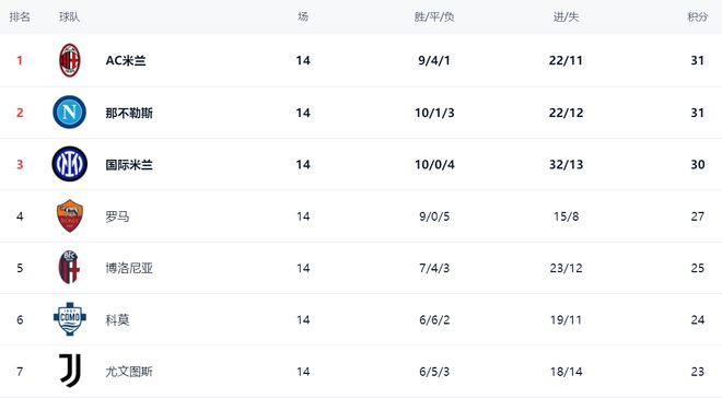 在积分榜上,前2的积分相同。AC米兰总积分31分,以净胜球的优势,登上榜首位置。而同样31分的那不勒斯只能屈居第2。国际米兰以30分排名第3。第4的是罗马,只拿到27分,与榜首有4分的差距。博洛尼亚25分排名第5。第6的是科莫,拿到24分。尤文图斯只拿到23分,排名第7。拉齐奥和亚特兰大的战绩都很差。拉齐奥19分排名第10,而亚特兰大只有16分排名第12。